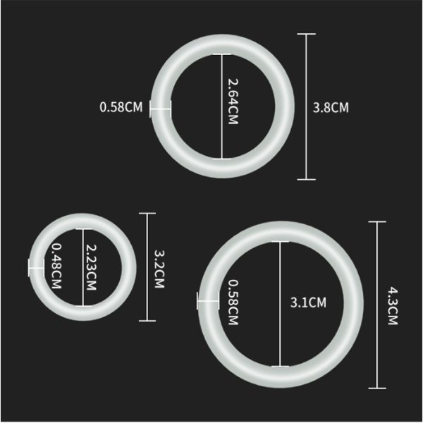 Kit de 3 anillos peneanos de diseño irregular que ayudan a mantener la erección y retardar la eyaculación. Se coloca en la base del pene erecto, y al ser tres unidades de distinto tamaño se pueden colocar en testículos y glande.